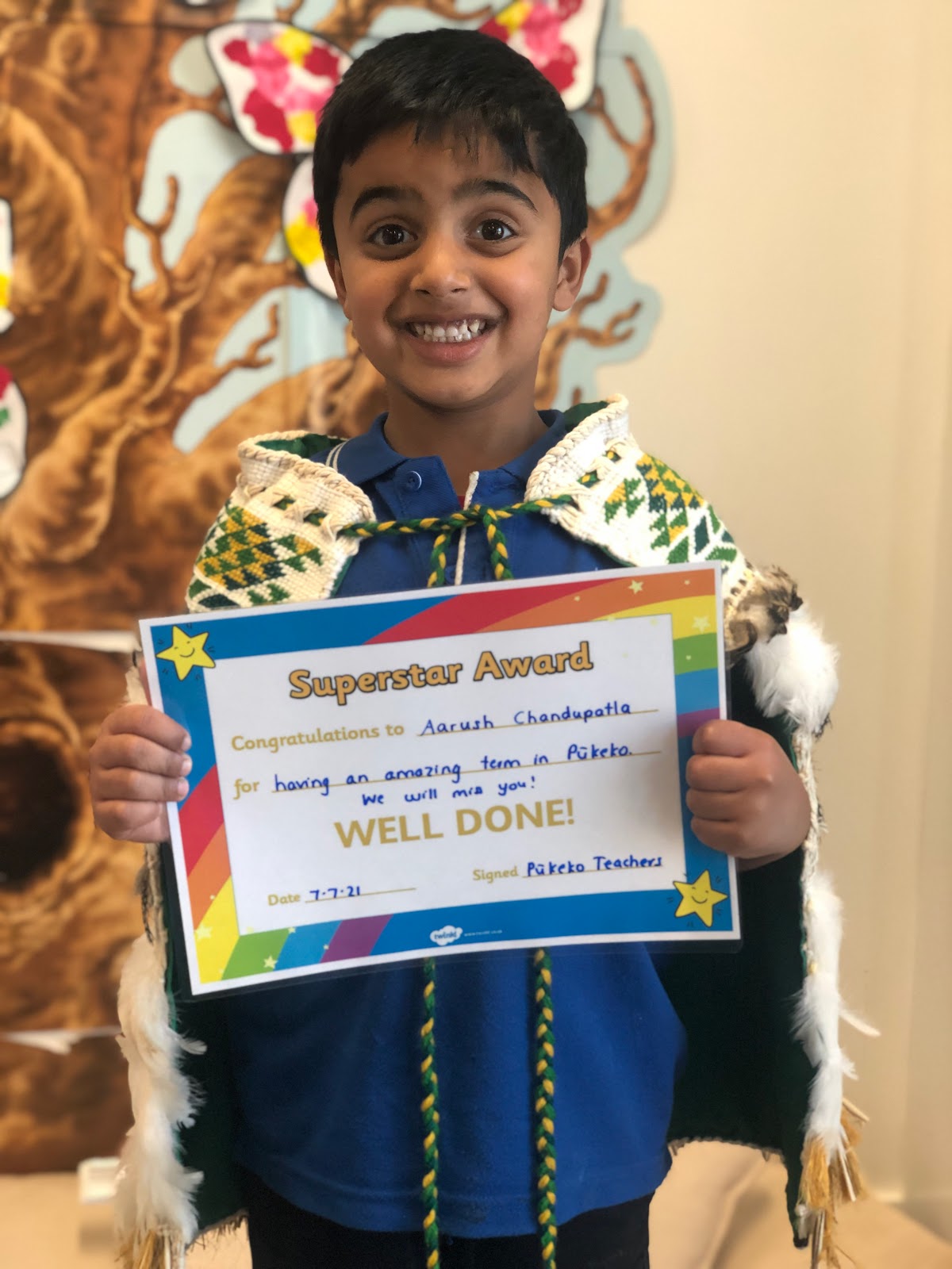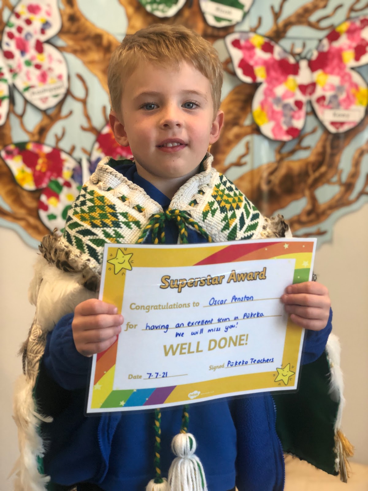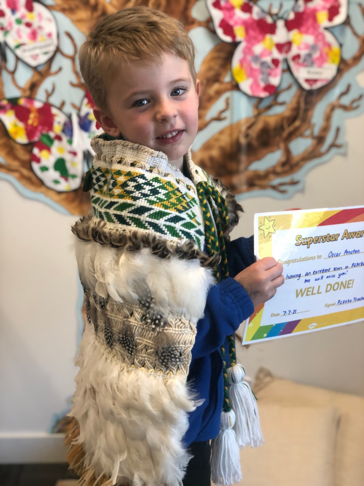 At our Pūkeko Graduation today, all of our friends who are moving through to Toroa got a special certificate. They also got to wear Miss Muriel's extra special kākahu. A kākahu is like a korowai - a special Maori cloak.